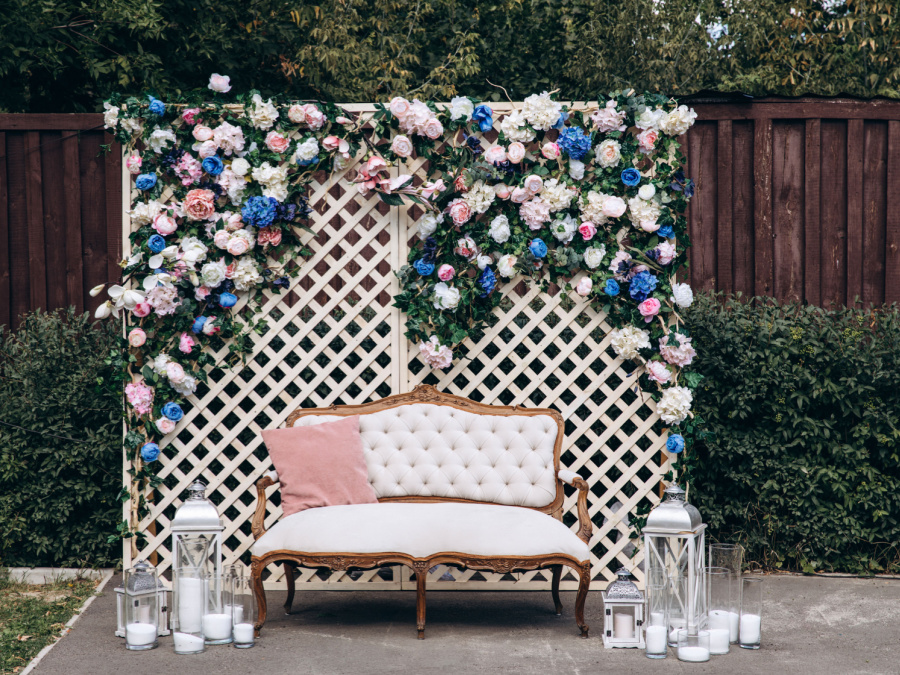 - صنع إطارات وأكاليل دائرية ومنحنية على خلفية المقاعد وأذرعه بالأوراق الخضراء والزهور الطبيعية أو الصناعية.